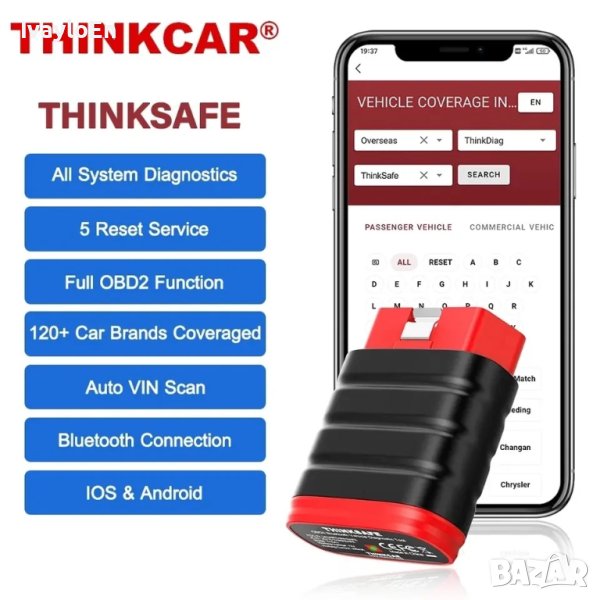 Thinkcar THINKSAFE OBD2 скенер Bluetooth, четец на кодове за всички системни грешки за всички автомобили.