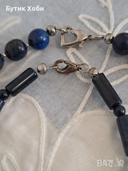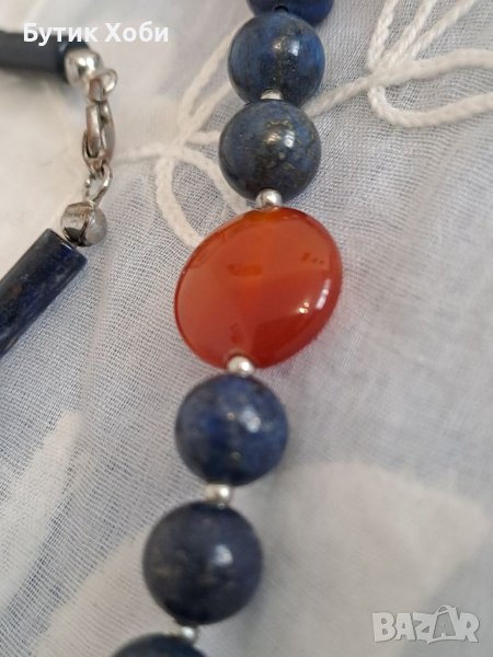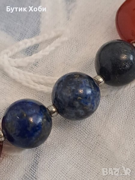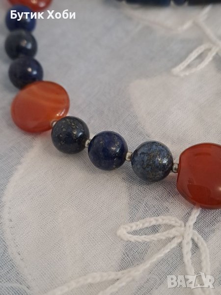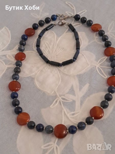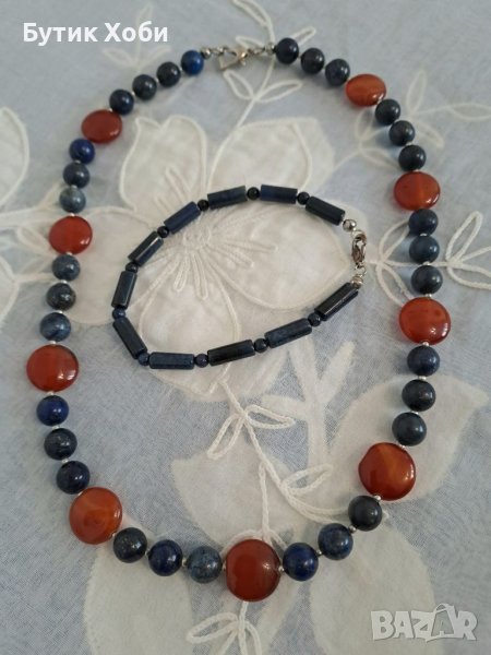 Семпъл и ефектен едновременно, комплект от колие и гривна. Натурални камъни - лазурит и карнеол. Дължина : колие - 45см ; гривна - 19см.
