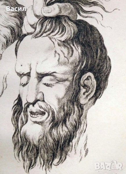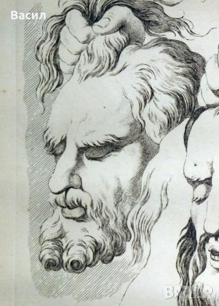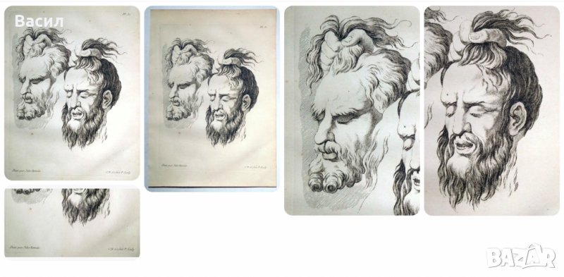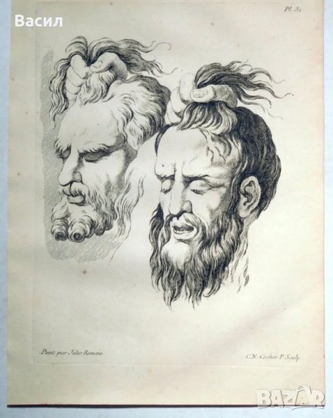 Изобразяване на две отсечени глави на един лист. Двете брадати глави в античен стил са хванати за косите си с две ръце в полупрофил вляво. В долния ляв ъгъл е името на художника на оригинала Giulio Romano (около 1499-1546). В долния десен ъгъл е отпечатаният подпис на гравьора Чарлз Никола Кочин I (1688-1754). Табло 32 от произведението, публикувано от Чарлз Никола Жомбер в Париж през 1755 г.: method pour apprendre le dessin .... Тази школа за рисуване съчетава плочи, създадени за това произведение, с публикувани преди това офорти от различни художници.