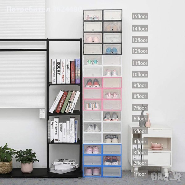 Кутиите се свързват една с друга, за да образуват стабилна структура. Всеки органайзер за обувки има отвор на предната стена, който улеснява достъпа до съдържанието.