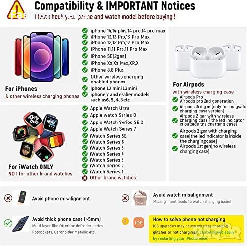 Тя е съвместима с iPhone и Apple watch и Air-Pods. Зареждане с кабел за iPhone 14/14 Pro/14 Plus/14 Pro Max/13/13 Pro/13 Pro Max/13 mini/12/12 Pro/12 Pro Max/12 mini/11/11 Pro/11 Pro Max/X/XS/XR/XS Max/8/8Plus/7/7Plus/6s/6s Plus/5/5s и Air-Pods 3/2/Pro/1 с Lightning порт. Безжично зареждане за Apple Watch ultra/SE/SE 2/8/7/6/5/4/3/2 (Забележка: само за продукти на Apple).