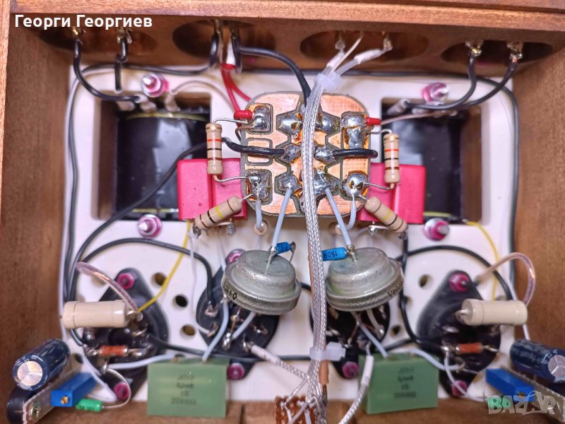 Използвани резистори на MULTICOMP и TESLA. Окабеляване по сигнал – сребърен коаксиален кабел, по захранване – OFC италиански меден проводник. Изходни трансформатори на Quad C-core с подобаващо секциониране, изчислени и изработени от мен (усилвателят е подходящ както за 4-, така и за 8-омови озвучителни тела). Корпус от масивно дърво, шаси и елементи по корпуса от технически камък. За цифроманите: изходна мощност – 5,5W/канал, честотна лента - 13Hz-50kHz, входна чувствителност 1V, входен импреданс 100kOhm. Размери усилвател: 215х190х160мм, на захранващия блок: 200х180х120мм. Доста сериозна мини-играчка за напреднали, и независимо от малкия си габарит свири вкусно и радва окото и ухото. Отлично се сработва с всякакви озвучителни тела, но има предпочитания към тези с по-висока чувствителност, за да разлюлее пода J. При сериозен интерес може да бъде чут при мен на двулентова Open Baffle озвучителна система Yamaha NS-18. Цената е валидна при вземане от място или изпращане по куриер, но след авансов банков превод. При куриер и с наложен платеж е с 15% по-висока.