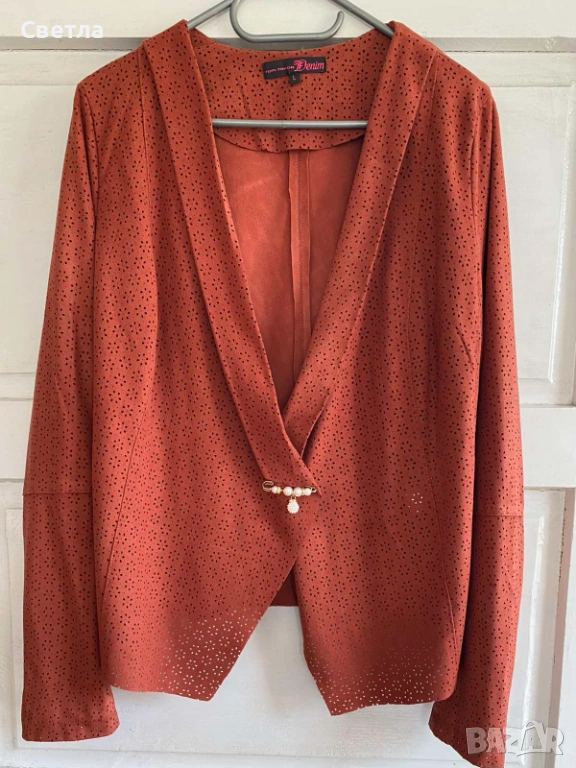 2. Елегантно сакоTom Tailor, цвят - керемиден. оригинална закопчалка. € 18. Р-р L, в см - ГО до 100см, длжина предна - 68см, на гърба - 58см Материя като мек велур