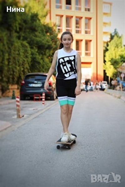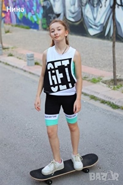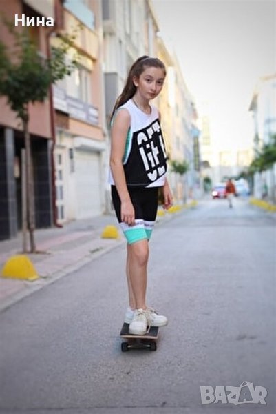 Спортен, красив, интересен и удобен 🔝 Комплект от 3 части, в черно- бяла комбинация с тюркоаз ✨ Бюстие, потник и клин - страхотна материя ⭐