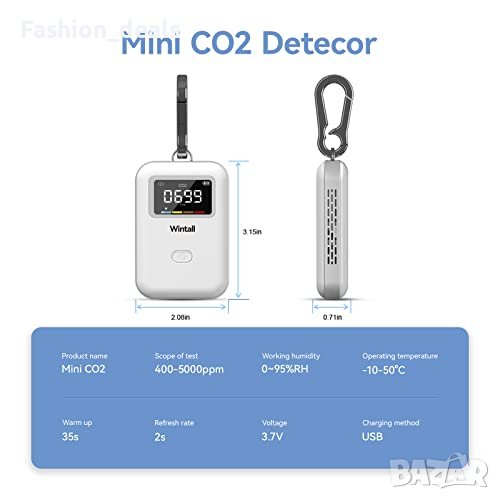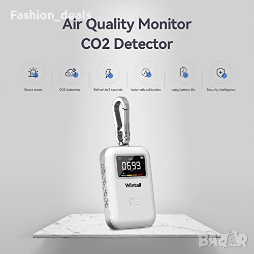 Wintall Mini CO2 Detector - стилен и лек монитор за качеството на въздуха, който точно открива нивата на въглероден диоксид с високоефективния си CO2 сензор. Този мини монитор е лесен за пренасяне и може да се използва навсякъде за проверка на качеството на въздуха. Устройството разполага с алармена система, която се включва, когато концентрацията на CO2 надвиши 1000ppm. То има функция за наблюдение в реално време с екран, който показва концентрацията на CO2 за 1 минута след кратко щракване. Устройството се захранва от USB акумулаторна батерия с капацитет 900 mAh и има работно време от 8 часа след 2,5 часа зареждане. Идеален за използване в различни условия, включително в домове, офиси, селскостопански насаждения, оранжерии, производствени складове и др.