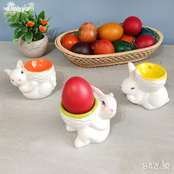 Малка поставка с форма на зайче, държащо кошничка за първото боядисано Великденско червено яйце. Красива керамична поставка, която ще краси дома ви, заедно с първото боядисано яйце.