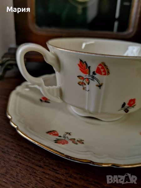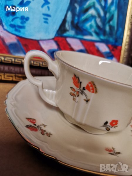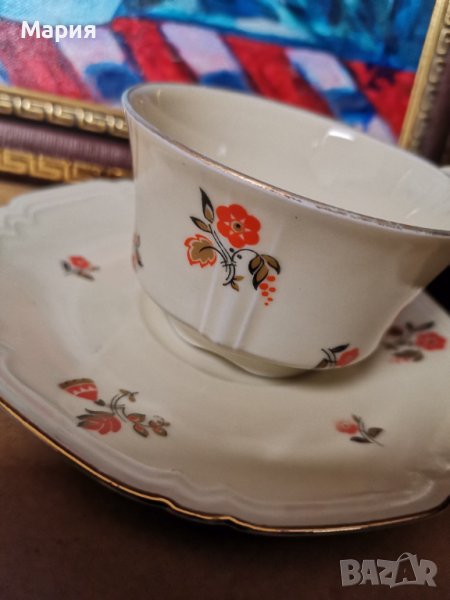 Art Deco Bohemia Czechoslovakia, Gebruder Benedikt Meierhofen, чаша за кафе с чинийка, цвят слонова кост с изключително финни оранжеви цветя и релеф, специален детайл върху дръжката на чашката, запазен златен кант и рисунък, маркировката датира от края на 19-ти, началото на 20-ти век. Диаметър чашка 8см.,височина 4,5см.,диаметър чинийка 13,5см. Отлично състояние. Цена за сет чашка с чинийка 25лв. Наличен 1 броя сет.