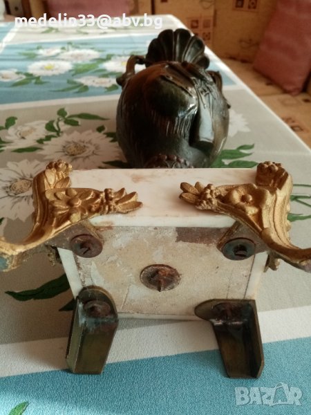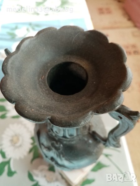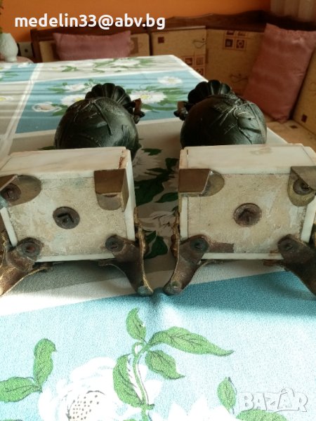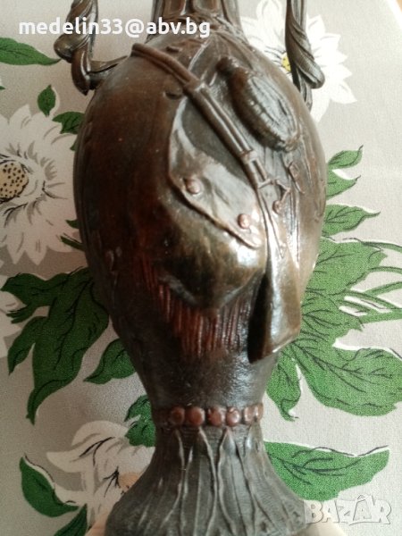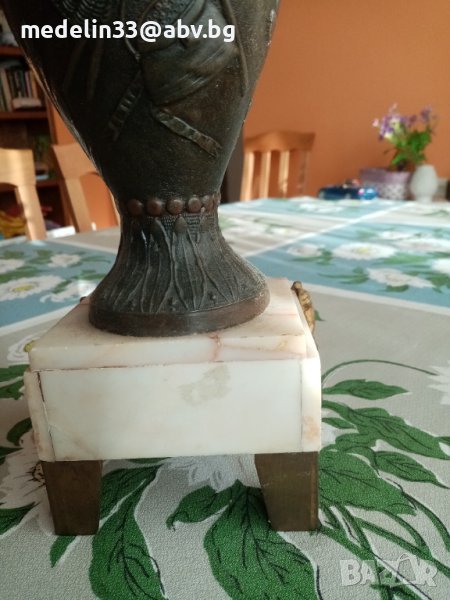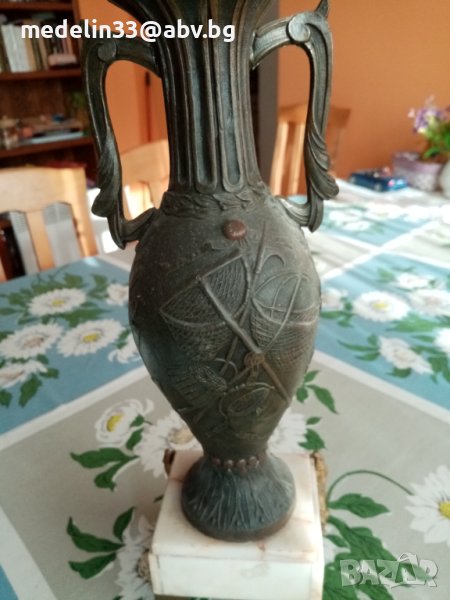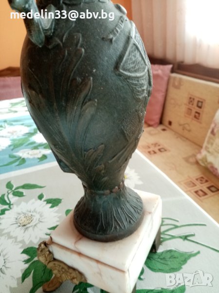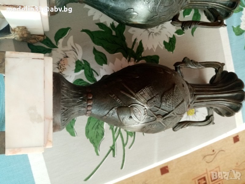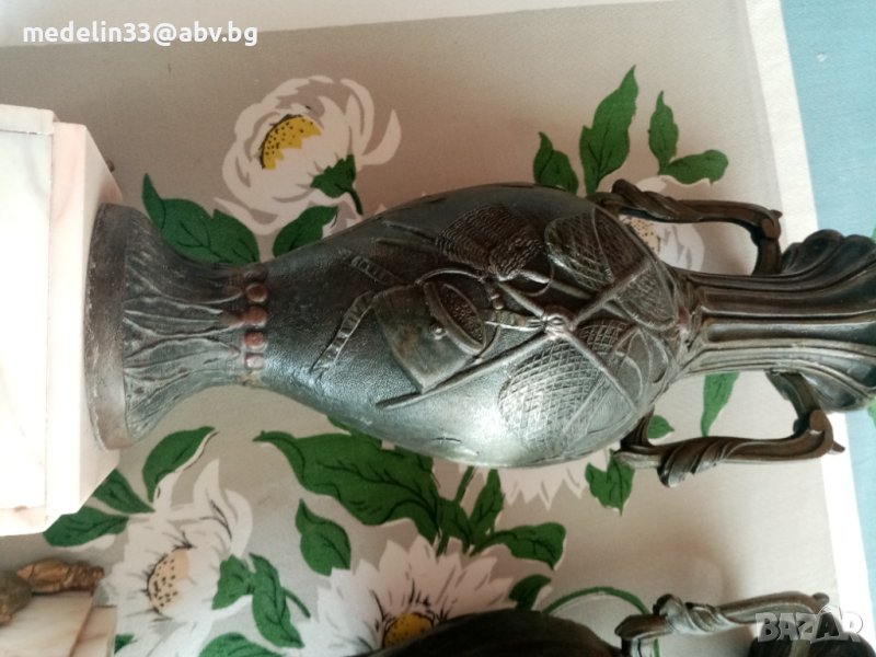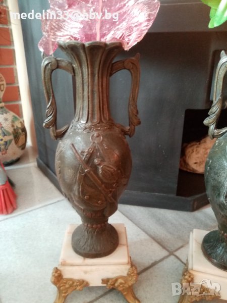 Вазите са прецизна отливка от бронзова сплав, много масивни и тежки с мраморна основа с орнаменти. Получени са в наследство от богат английски банкер, от ловна вила. Височина 40 см, тегло не едната ваза около 3 кг. Продават се заедно двете в комплект.