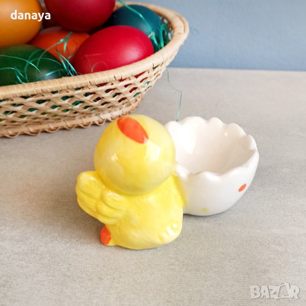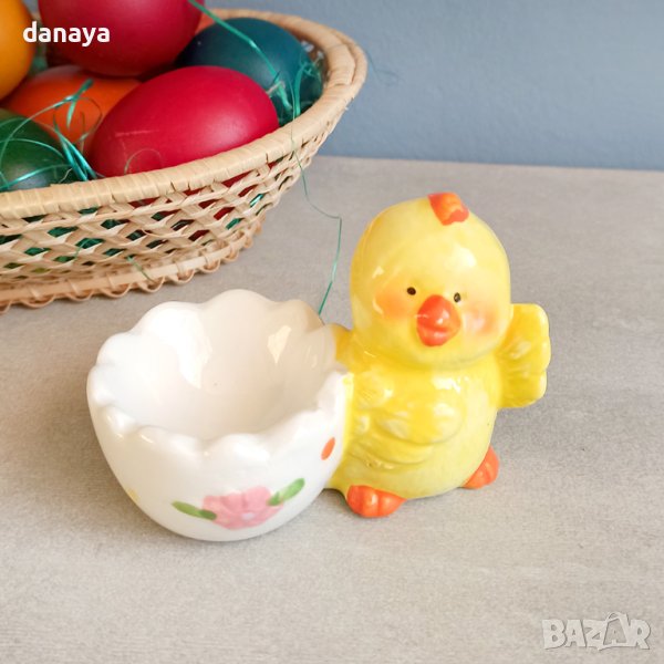 Малка поставка с форма на жълто пиленце, а до него бяла кошничка за първото боядисано Великденско червено яйце. Красива керамична поставка, която ще краси дома ви, заедно с първото боядисано яйце.