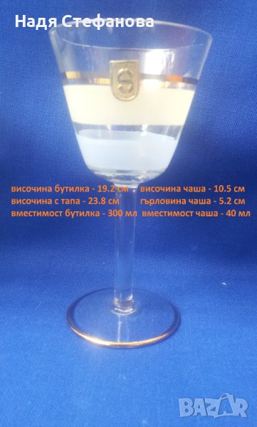 Прочетете моля много внимателно поясненията към обявата. Ако след прочитането нещо все пак не е изяснено, задавайте въпросите си тук чрез съобщение или на посочения телефонен номер. По принцип през деня съм в движение и е по-сигурно да мога да отговоря по телефона след 18 ч. При изменение редактирам обявата навреме. Ако направо харесвате нещо от обявата, директно може да го поръчате. Видно от снимките чашките са неползвани и нямат забележки. Бутилката е ползвана, но няма забележки по стъклената част. Канта при гърлото има забележки, но нищо съществено. Цената на петте чашки е 35 лв, а на бутилката е 15 лв. Посочената цена от 39 лв е когато се вземат в комплект и това е отстъпката. Изпращам добре опаковано от мен по Еконт с опция преглед и евентуално тест преди да се плати. НЕ ИЗПРАЩАМ ПО СПИДИ!!! Куриерската услуга е за сметка на купувача, но подготвям товарителницата през Базарбг и по тази причина имате отстъпка от 10% от нея. Изпращам след като тук на съобщение имам