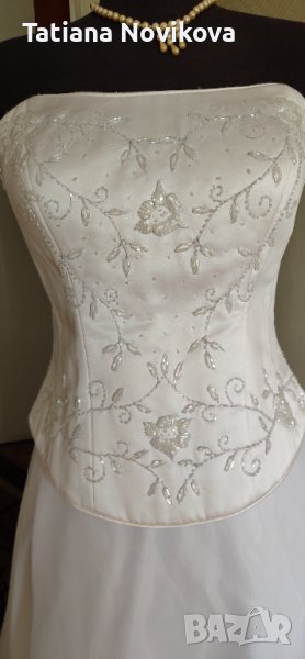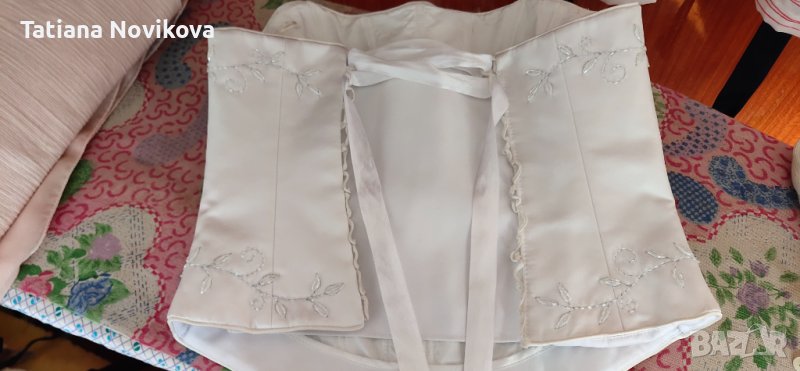 Твърдо бяло бюстие с ръчно нашити мъниста,със чашки, с връзки и платка под тях.