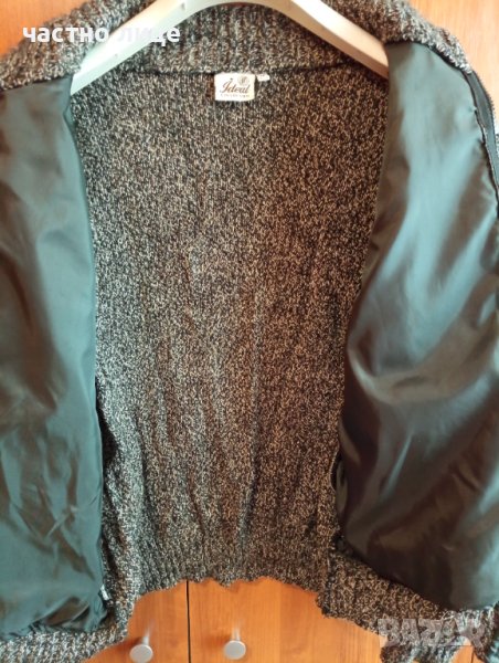 Предлагам машинно плетена (с вълнена прежда) жилетка тип яке комбенирано отпредна страна с еко кожа отдолу е с подплата само в предна част. Има и два джоба.