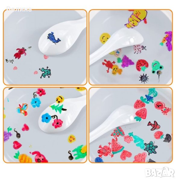 Необходимо е само картинката да се нарисува с магическите водни флумастери върху порцелановата лъжица, която бавно да се потопи във водата.