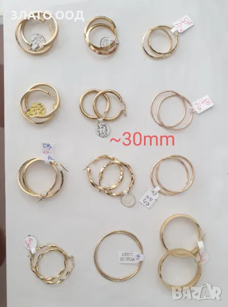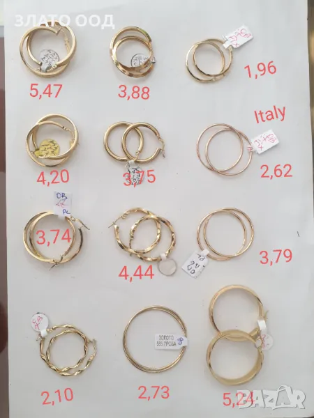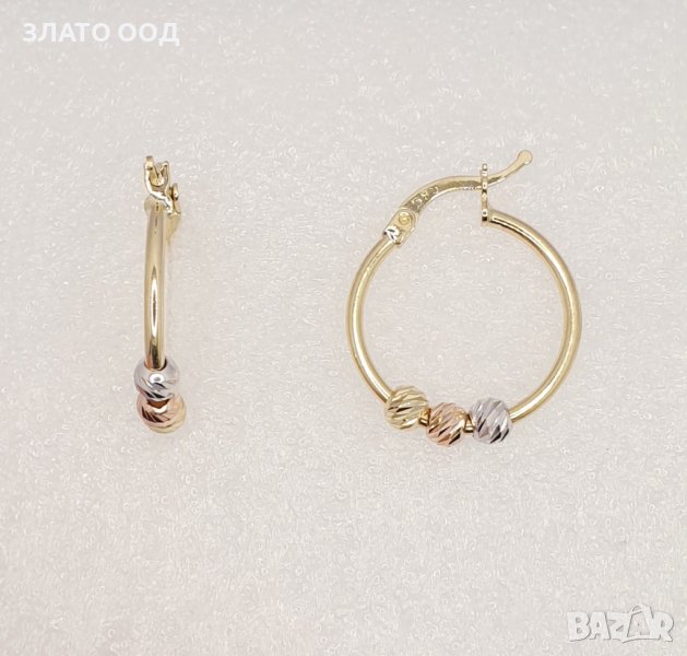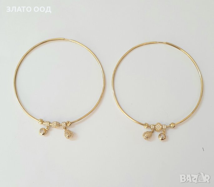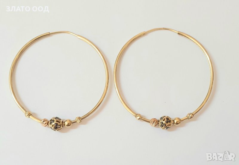 Златни обеци тип халки. Сертификат и маркер 585-14К. Тип Пандора със различни топчета и мотиви. Тегла от 2,70 до 10 гр .и диаметри от 2см до 7 см. Обявената цена е за 1 гр., като цената може да варира + или – в зависимост от борсовата цена на златния материал за деня. .