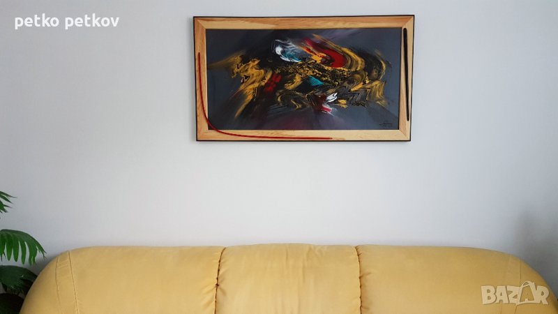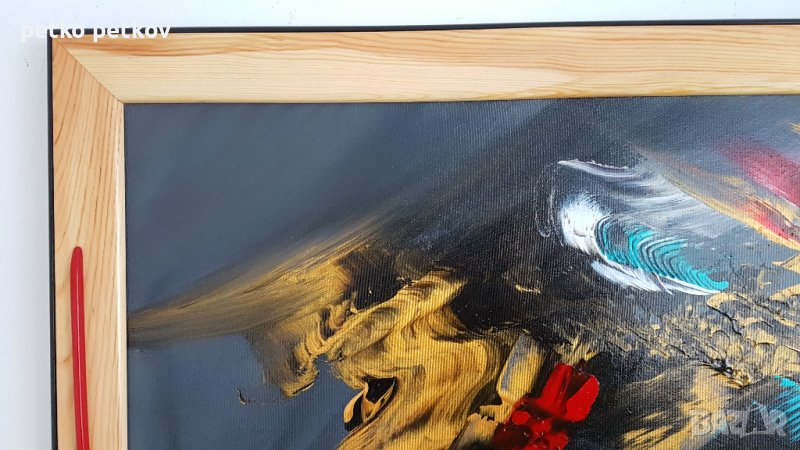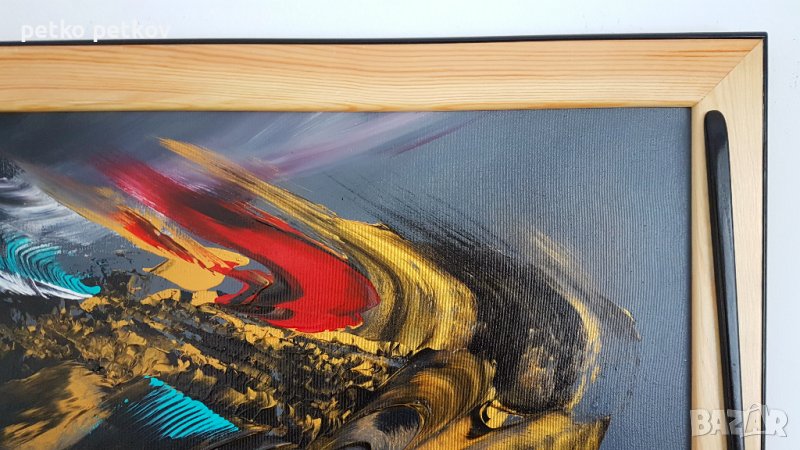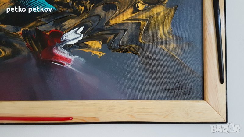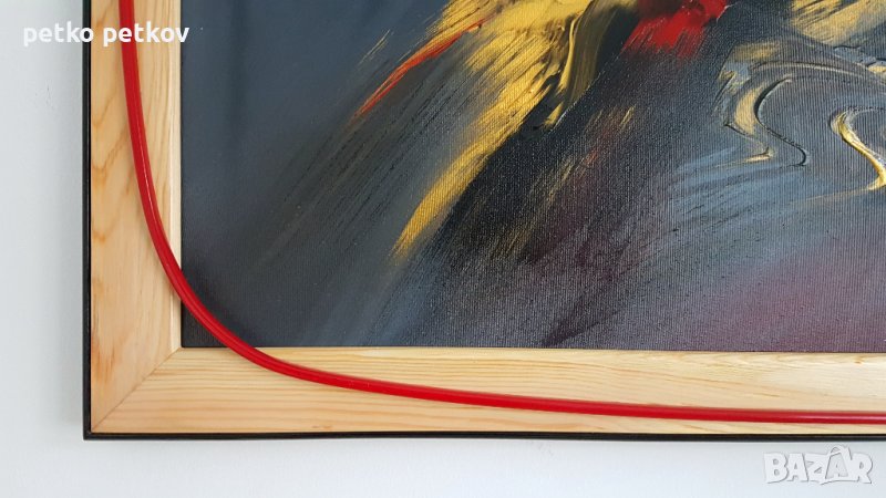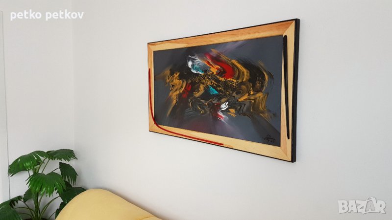 Акрил върху платно с подрамка. Собствено производство дървена рамка-уникат. Размери с рамката - 97/54см.