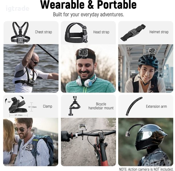 【Каишки за глава, гърди и каска】. Регулируемите ремъци са подходящи за различни размери на главата и форми на тялото. Те ви помагат да заснемате поглъщащи POV кадри по време на екстремни спортове, като сърф, скейтборд, скокове с парашут и бънджи. Каишката за каска закрепва екшън камерата към каска за шосейно колоездене, планинско колоездене и BMX състезания.