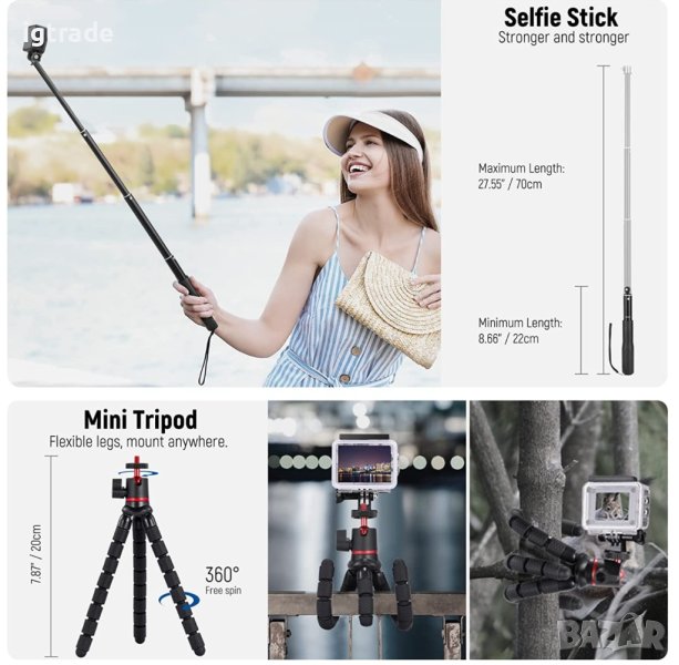 【Гъвкав статив и селфи фон д】 Гъвкавият статив с огъващи се крака може да се увива около клони и стълбове, като поддържа стабилността на фотоапарата ви върху неравен терен. Лекият селфи стик улеснява правенето на селфита или видеоклипове в движение