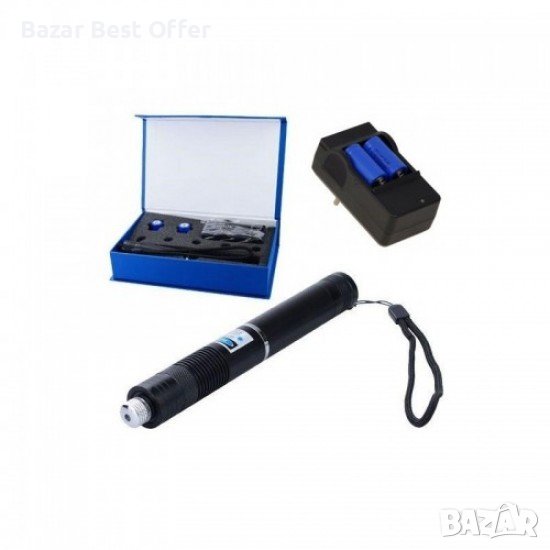 Мощен син лазер с акумулаторни батерии и зарядно, пълен комплект. Пет сменяеми дискотечни приставки с различни дискотечни ефекти. Този лазер може да прогори само за секунди дупка в някои материали, да запали цигара или клечка кибрит, да спука балон на разстояние над 10-15 метра и др.