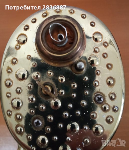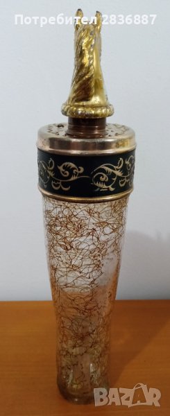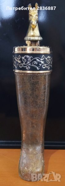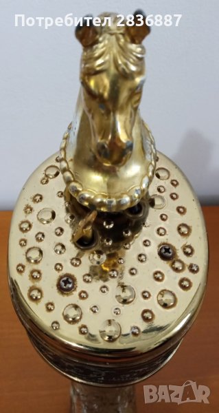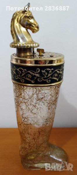 гарафа с форма на ботуш. Има декоративен метален капак с накрайник за изливане, красива метална тапа във формата на златна конска глава и вградена музикална кутия. Чашата е украсена със златен дизайн на вихър. Тази бутилка западен кънтри алкохол би била забавно допълнение към всяка барова колекция. Маркирана е на дъното и има следи от етикет и вероятно е от 1960 г.