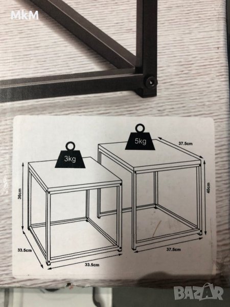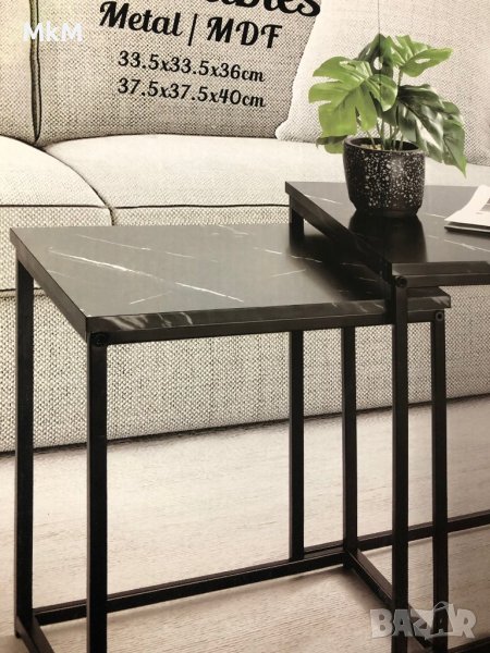 Размери се виждат на снимката. 2 броя маси с плот ефект на мрамор. Стилни и удобно с метална конструкция.