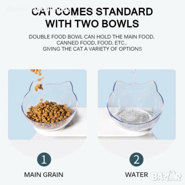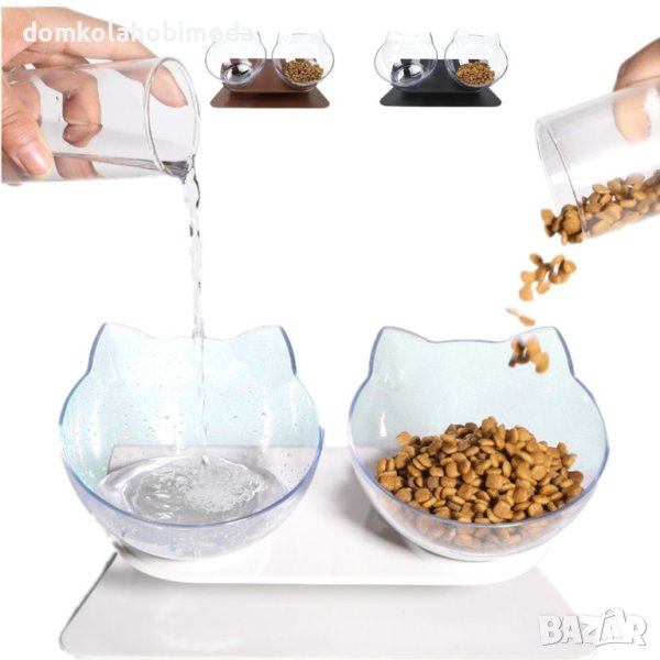 Удобен комплект от две купички с поставка, която не позволява разливането върху подовите настилки в дома.