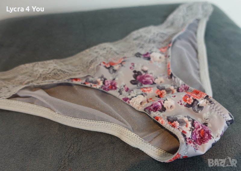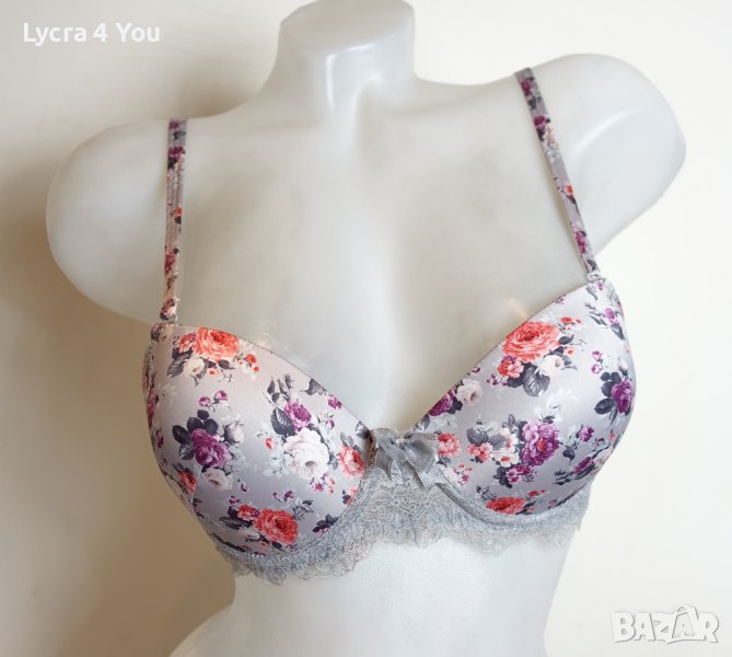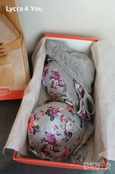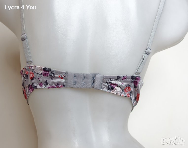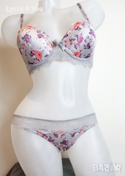 Сутиенът е със сменяеми презрамки, налични са и силиконови в комплекта, с банели и леки дунапренени подплънки. Невероятна комбинация от сив сатен и нежен тюл с флорални цветни мотиви, в луксозна картонена кутия.