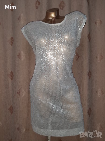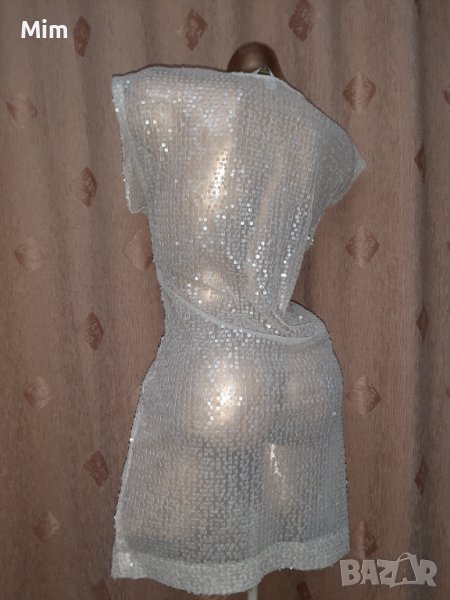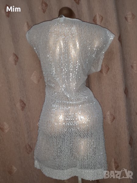 Бял прозрачен еластичен тюл с зашити бели пайети . Под мишниници 55 до 63 см едностранно ,ханш 51 до 60 см едностранно, дължина 90 см .неразличима от нова без хартиен носител.