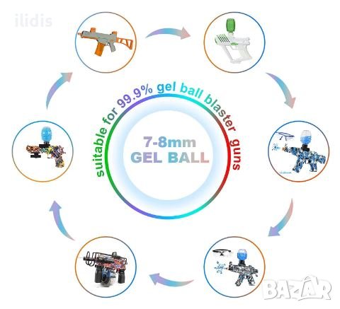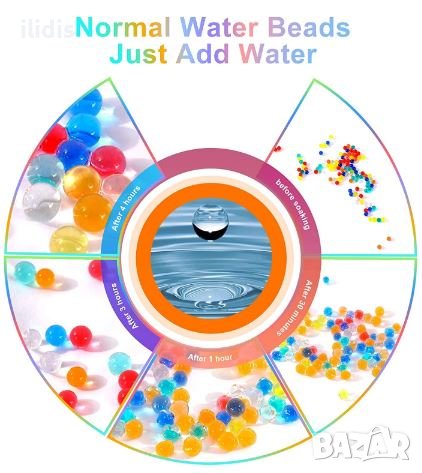 - 10 000 гелови топчета в комплекта, които, след като се накиснат във вода, променят размера си от 1 до около 7-8 мм в диаметър.