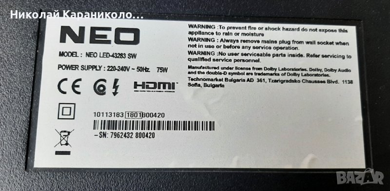 Продавам тв. NEO LED-43283SW за части по причина-счупена матрица/VES430UNDB-2D-N12/.Редовни съответно:
