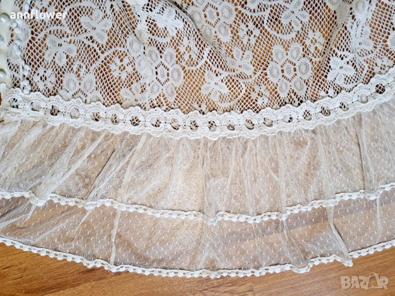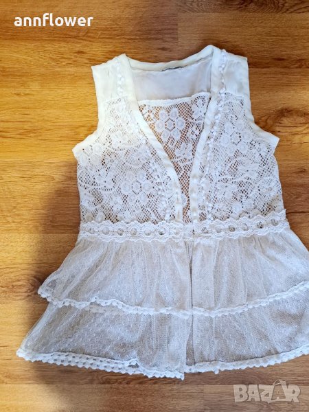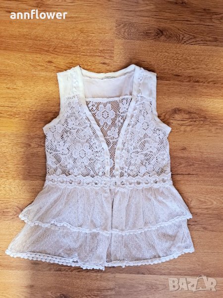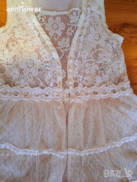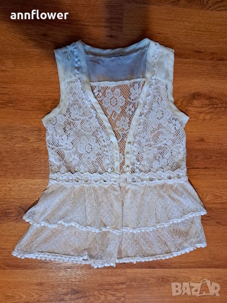 Дантелено елече. Цвят шампанско . Размер S. Дължина 58см, ширина на рамената 33см, ширина в мишниците едностранно измерена 40см, ширина в талията 37см.