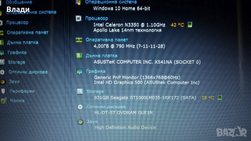 Дъното работи - процесорIntel Celeron N3350 (2-ядрен, 1.10 - 2.40 GHz, 2MB кеш) 4GB рам и видеокарта Intel HD Graphics 500 1GB - 60лв.
