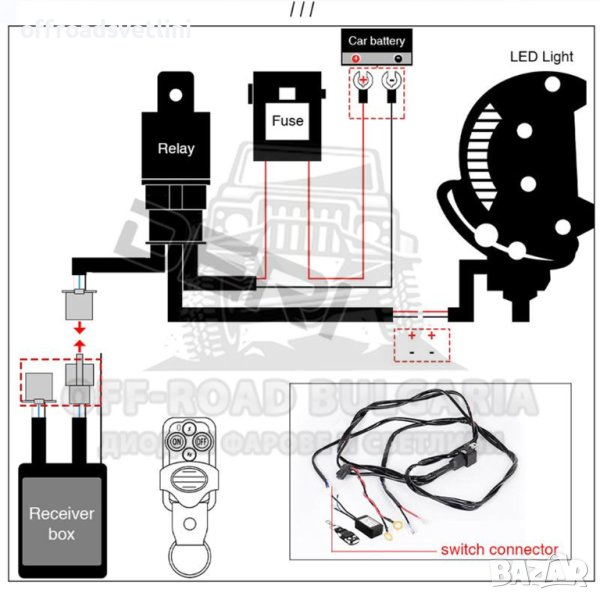 Окабеляването е снабдено с кабелни обувки, предпазител, реле и ключ - прекъсвач с led индикация за включени и изключени светлини.