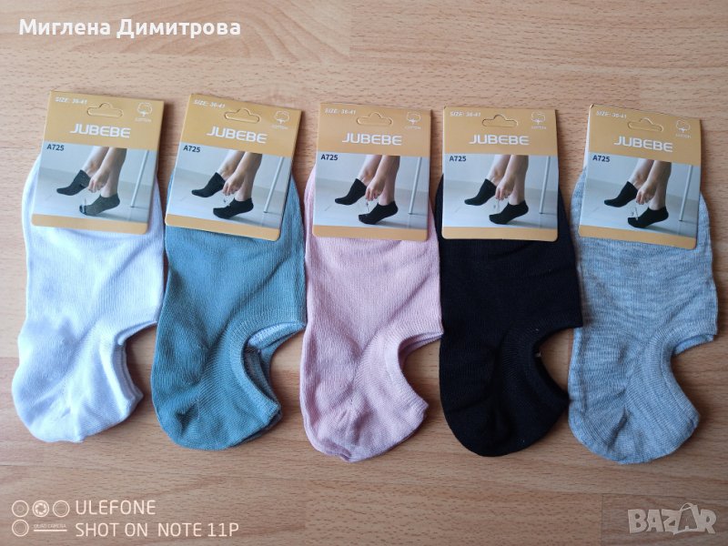 Цветовете са черен, бял и сив размер 41-47. От размер 36-41 има цветни, бели и черни. Всички са едноцветни без надписи и шарки. Материя 95% памук и 5% еластан, много добро качество. Цената е 1 лев за чифт.