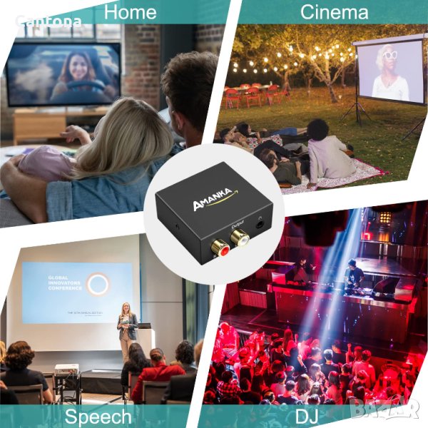 - Може да работи с PS3, Xbox, Blu Ray плейъри, DVD, системи за домашно кино и други устройства, които нямат RCA L/R или 3,5 mm жак изходи. Не е съвместим с 5.1 канални сигнали като Dolby AC3.