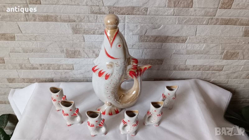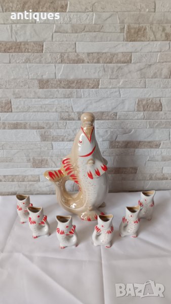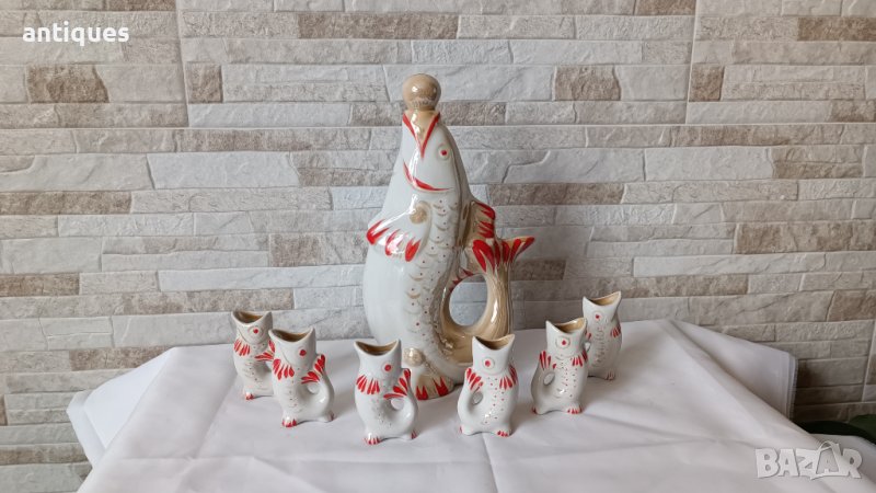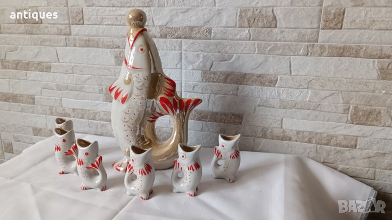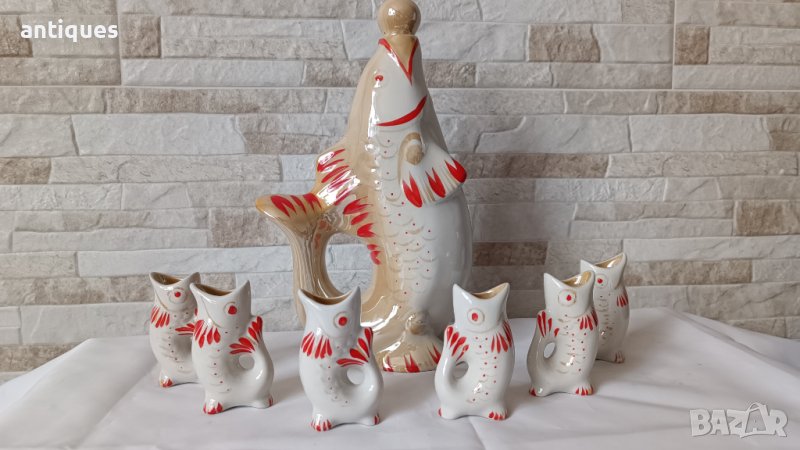Рядък сервиз за ракия с Риби в бял и червен десен.