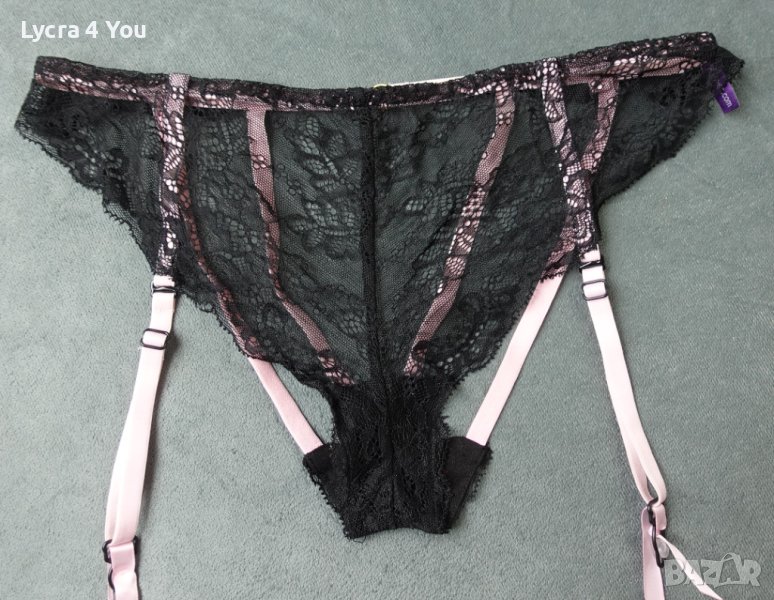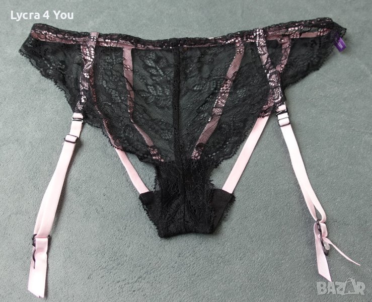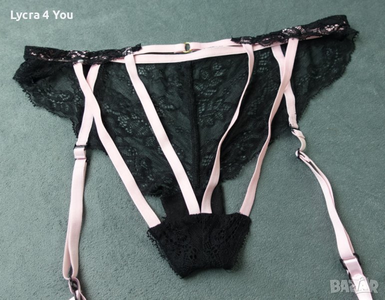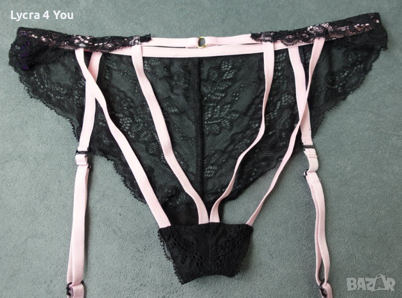 Неразличими от нови, страхотни еротични бикини/бразилиани с черна дантела и розови ластични ленти с откачащи се розови жартиери.