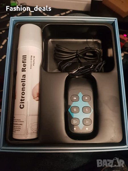 Това устройство за обучение на кучета излъчва цитронела спрей, вибрация и звуков сигнал, за да помогне за обучението на кучетата и да спре нежеланото им поведение. То има три режима - пръскане с цитронела, вибрация и звуков сигнал - всеки с две нива. Дистанционното управление може да работи на разстояние до 500 фута/167 м и има презареждаща се литиево-йонна батерия, която може да издържи до 12 дни след 2-3 часа зареждане. Нашийникът е регулируем и може да пасне на кучета над 8 фунта/3,6 кг и на възраст над 6 месеца, като дължината на каишката е 8-27 инча/20-68 см. Нашийникът също така е водоустойчив и се доставя със спрей с цитронела, който може да се пълни отново. При презареждане кутията за пълнене със спрей трябва да се държи в изправено положение и да се натисне силно в отвора за пълнене за 15 секунди.