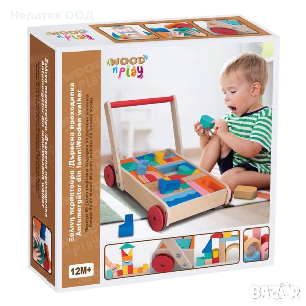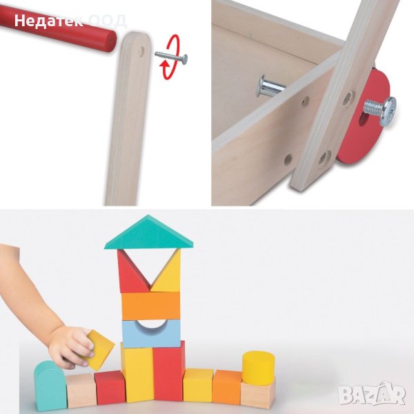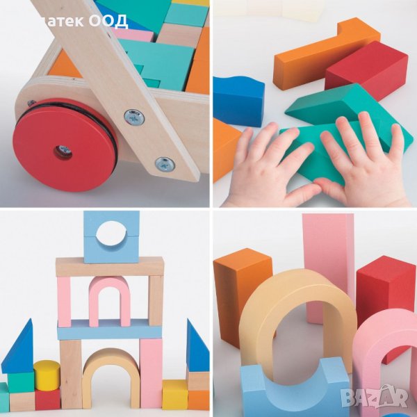 Дървена играчка проходилка с цветни тухли.Напълнете, изградете, съборете, носете, бутайте, дърпайте, играйте.Това е играчка, която детето може да използва по много различни начини.Използвайте блоковете, за да практикувате броене, разпознаване на цветове и форми.
