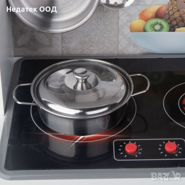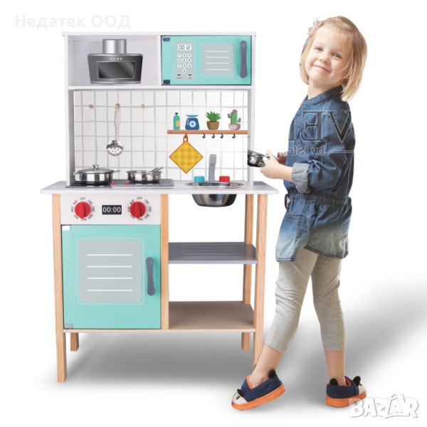 Дървена кухня играчка с 5 метални аксесоара, светлини и звуци. Това е фантастичен начин да се забавлявате и да учите. С много функции като електрическо осветяване на котлоните и истински звуци при готвене. С микровълнова но и печка която свети с копчета! Съдържа 5 метални аксесоара за безкрайно готвене. Работи с 2 батерии АА (не са включени).