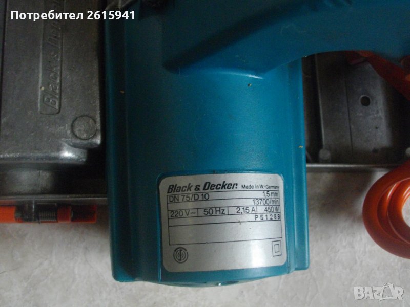 ОПИСАНИЕ на синьо ел.ренде 450 вата Блек Декер - 199 лв. Почти ново, от старото качествено произовдство на марката /професионално/. Марка и модел - Black Decker DN75 D10. Производство упоменато - Made in W.Germany. Отлично състояние /визуално и работно/. Без забележки. Почти ново. Характеристики - мощност 450 вата ,стружуване регулация до 1,5 мм. Защита -2,15 ампера. Работно напрежение - 50 херца, захранване - 220 волта, скорост - 13700 об/мин. Оригинален на марката оранжев кабел /характерен за старото качествено произовдство от преди години/. Автозащита на спусъка. Алуминиев голям и дълъг работен плот, еднокомпонентен /излят заедно с предната алуминиева част на корпуса. Ножове размер 74 мм. Поставени 2 оригинални ножа, които са отлични, без никакви наранявания и са като нови. Размери на машината - 190 х 165 х Н140 мм. Тегло - приблизително 3,0 кг.