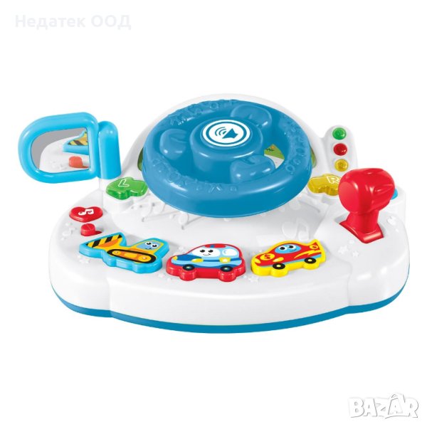 Играчка с волан за забавление на детето и изучаване на форми, цветове, светлини, звуци от коли и музика.С въртящо се огледало, бутон за включване/изключване и звуков ефект на смях.Работи с 3 батерии AAA (не са включени).