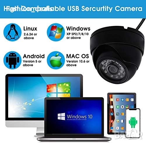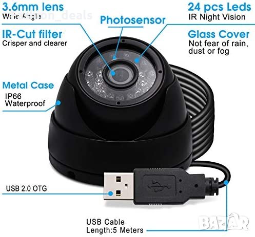 Тази външна USB камера предлага Full HD 1080P резолюция и висока честота на кадрите за гладко качество на изображението. Тя разполага с водоустойчив метален защитен корпус и 5-метров USB кабел за използване на открито, както и с вградени инфрачервени светодиоди за нощно виждане. Камерата се препоръчва за използване в сферата на сигурността, включително системи за наблюдение на дома и наблюдение на животни. Тя се захранва изцяло от USB и е съвместима с различни системи, включително Windows, Mac, Linux и Android. Работи с повечето софтуери за наблюдение, като ISpy, ContaCam, ManyCam, Yawcam, Webcam Viewer и IP Camera Viewer.
