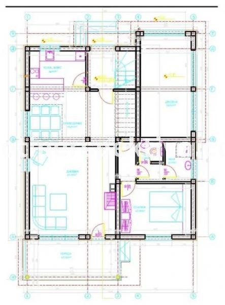 Втори етаж - три спални, едната със собствени баня и тоалетна, две детски с общи баня и тоалетна. Перално помещение. Опция за 18кв.м. тераса.Капандура със стълба към таванско помещение за багаж.