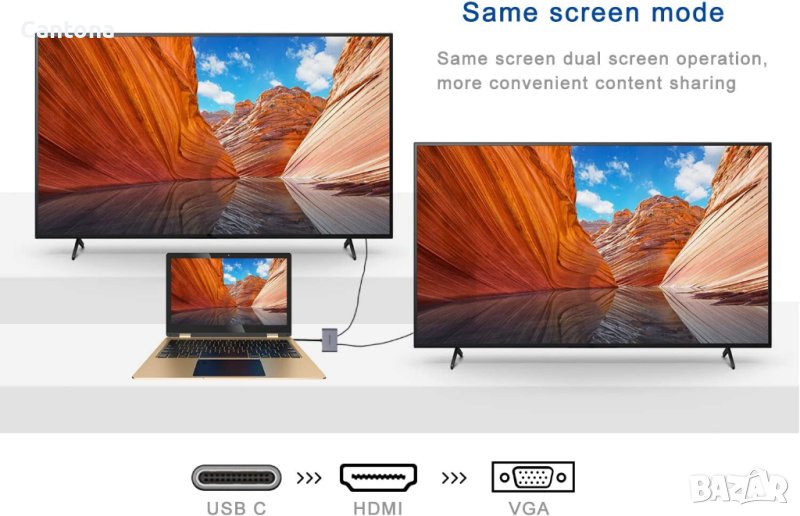 Този тип C към HDMI VGA конвертор е удобен за свързване на лаптоп тип C към външен дисплей и проектор.VGA изходът поддържа 1920x1080P@60Hz Full HD изход.HDMI поддържа 4K*2K@30Hz ултра ясен изход.Забележка: Разширен режим, докато vga и hdmi работят едновременно, два монитора показват само едно и също съдържание.