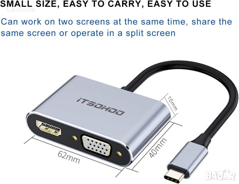 iTSOHOO USB TYPE C към HDTV VGA конвертор, използва йонизирано покритие от алуминиева сплав, гладко и компактно. Прилагат се множество защити за пренапрежение, прекомерно зареждане, прегряване.Алуминиева плоча за силен антиоксидантен капацитет и стабилно пълно предаване на сигнала.
