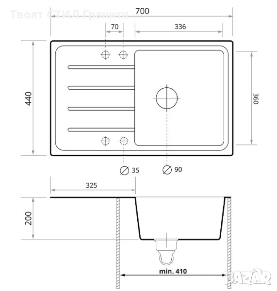 Продуктовите снимки показват предложената инсталация със сифони предлагани от Нас. Преливникът и цедката, които се виждат на графиката, не са елементи от мивката и се продават отделно.