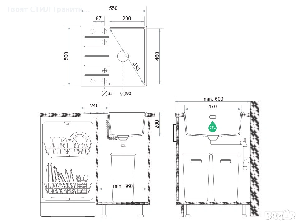 Зелената линия показва необходимото пространство в мм за монтаж на мивката в шкафа !!!