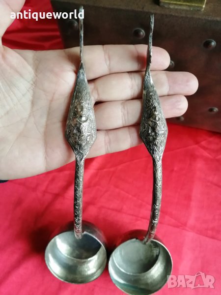 Много Красиви Супер Редки Орнаментирани Стари Тайландски Церемониални Прибори за Ориз, Черпаци.Покритие СРЕБРО.В основата на дръжката е изобразена Богинята Савасте