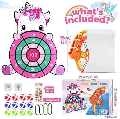 Играчка за хвърляне на дартс на тема еднорог. Комплектът включва 12 топки, 2 кукички, 1 панделка, 1 лист със стикери и чанта за съхранение. Таблото за стрелички е лесно за окачване и може да се използва както на закрито, така и на открито. Той помага за развитието на двигателните умения и координацията ръка-око, което го прави отлична образователна и интерактивна игра за деца. Играчката е изработена от висококачествена мека материя и е безопасна за употреба. Предлага се в подаръчна кутия, което я прави перфектен подарък за децата по различни поводи.