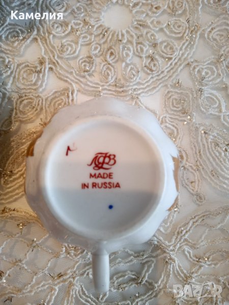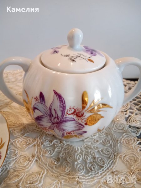 Руски сервиз за кафе за двама от ЛФЗ Златни листа. Първо качество ( червен печат), ръчно рисувано злато Чайник, захарница, латиера, 2 чаши за кафе 150 мл, 2 чинийки и 2 десерти чинии. Капачка на захарница малко по различни цветя.( последна снимката). Без забележки.
